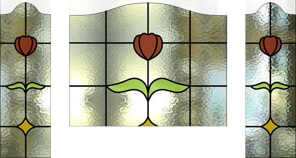 Hello Sam & Will, below is your drawing showing how the supplied design would look in your glass size and shape. the base glass used is called Minster and I think this suits the era of the door style but we can change this if you would like a different base glass. We do not have the information as to where the 3 panels sit in relation to each other but if you provide this, we can alter the drawing to show the panels more accurately.