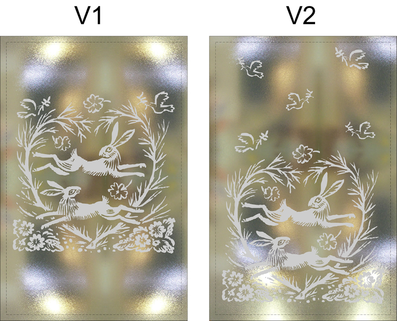 Hi Heather, below are 2 options of the design you requested. We decided to create 2 versions because the artwork supplied does not fill out the full height of the panel so we wanted to give you that option. The base glass will be Stippolyte Glass and the design will be sandblasted (etched). Please let the studio know if any of these versions are fine for us to proceed with manufacture.