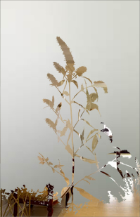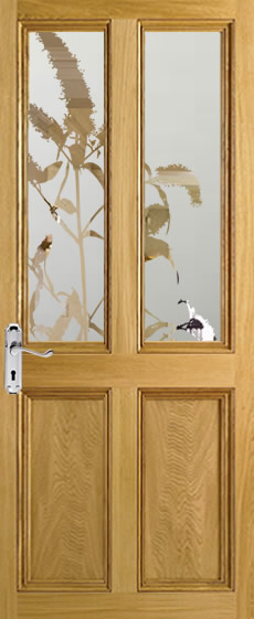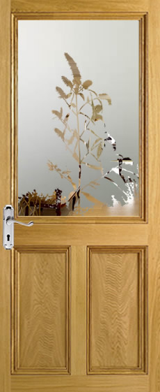 The designs shown here are created with a etched glass background with the flower and leaves in clear glass. There are no coloured section in these designs at all so if you can see colours, it is just what can be seen behind the glass through the clear areas. The Buddleja design is design is very detailed and you will only see how intricate the flower edges are when you come face to face with a finished panel.