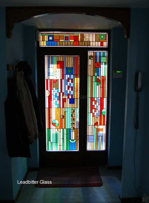 Our Overlay Stained Glass design was created with every section of the glass being coloured except for the outer border. We used our standard antique lead strip. Most of the coloured sections were plain transparent colours with a few wisp colours to give an abstract effect. Before we created the actual glass we created a computer generated image for approval of the design. View the customers Client Page