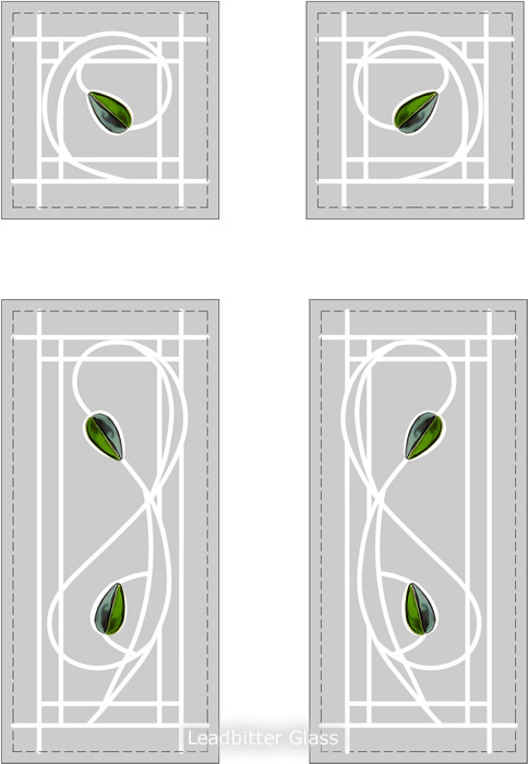 Hello Rosemary, below is your drawing showing you how the 513 design looks in your smaller glass sizes. The background shown light grey will be etched glass with all of the white lines being clear glass. The fused glass leaves will be our Cecily Leaves. The dashed line is the visible area. Please let us know if it is fine to move forward to manufacturing the glass.