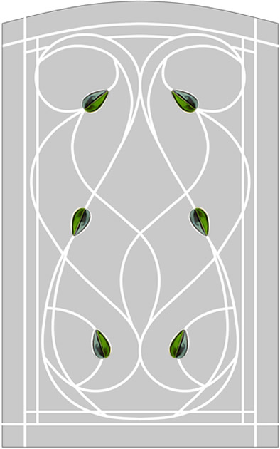 Hello David, below is your drawing of your chosen 269 design in your specific glass size and shape. the grey background in the image will be etched glass and all of the white lines will be clear glass. The leaves are our green Cecily Leaves. The border starts 52mm from the edge of the glass so you should see around 40mm before the border starts once the glass has been installed. One thing to note is that your glass will come with just a curve at the top as shown below. There will not be any flat steps in from the sides as your sketch seems to show. We do not have a template that shows this step-in so it would be created without these 2 steps on the left and right. If you can forward a full size template that includes these steps, we can cut the glass that shape.
