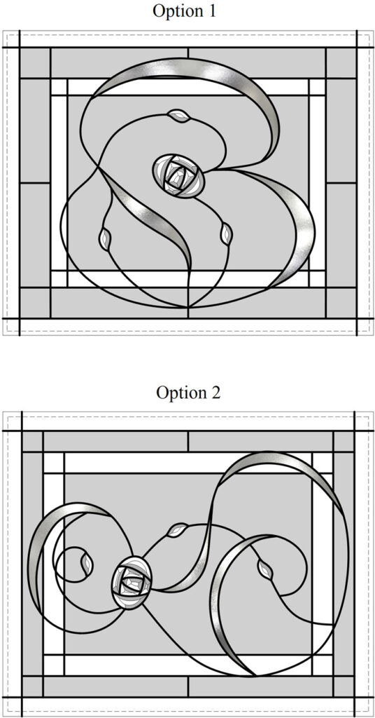 Hi Julie, below I have added 2 options for you to view. The designs are based on the 625 window. The dashed line is the visible area and the white sections will all be clear glass. The grey areas will be the sandblast film and the textured arcs will be Pebble texture. We would use our dark lead strip. Please let the studio know if any of these options are fine for us to proceed to manufacture.