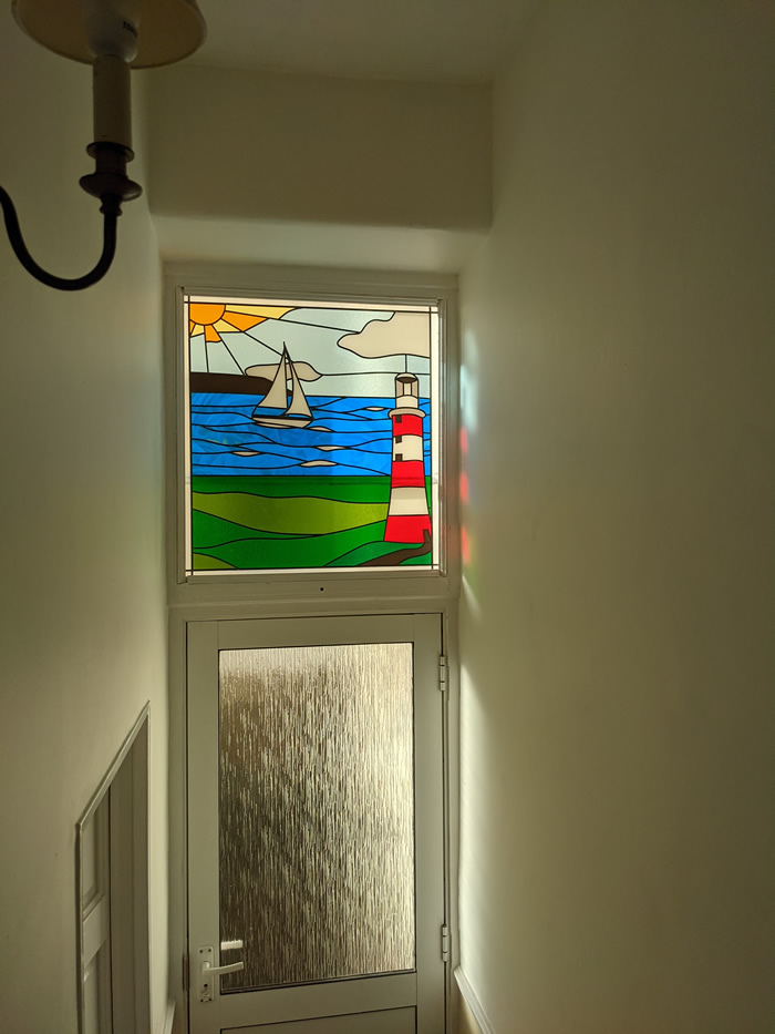 In 2020, we created a panel featuring a lighthouse and a boat to go over a client’s door in their Plymouth home. We used Stippolyte Glass as the base glass and the lead was our Aged Lead Option 2. You can see their client page here.