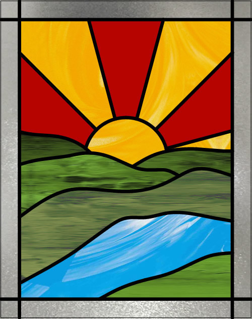 Hi Lee, below is our drawing of The Rising Sun design shown in your specific glass sizes and shape. The whole glass will be Stippolyte Glass and the glass will be a toughened double glazed unit. We do not have any visible sizes so please check your beading thickness. The lead border starts at around 30mm from the glass edge. Please let the studio know if it is fine to proceed with manufacture or if you require any changes to the drawing.