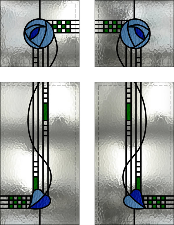 Hi Alan, below is the drawing of your chosen Blythswood Rose design shown in your specific sizes and door layout. The dashed line is the visible area so ignore everything past that line. In order to make the curved line flow properly from the top panels to the bottom panels I would need to know the gap in between those two panels. I have asked Nicholls Joinery for this measurement so I will update the image slightly once I receive this. The glass texture show would be Minster Glass.