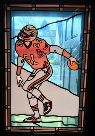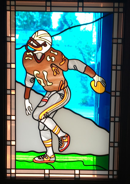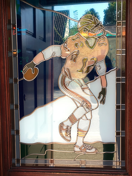 We created this American footballer panel recently for the First Down pub in Denny, Scotland. The original panel was not created by us but it had been broken and the pub owner wanted to have the glass replaced with the same design.
