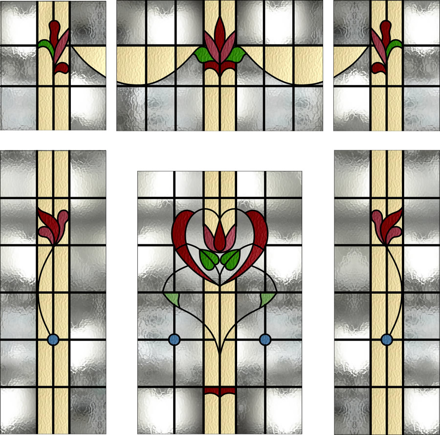 Hi Gordon, below is the drawing of your vestibule shown with your preferred design. One thing to note is the pale yellow running vertically will be very pale and it will not look as vibrant as it does in this image. The software we use to draw the glass struggles to show pale colours accurately. One thing we can do during manufacture is to send some photos of the actual glass once these sections are coloured so you can approve the real colours via photographs. The glass I have used for the drawing is Minster glass. Please let the studio know your thoughts.