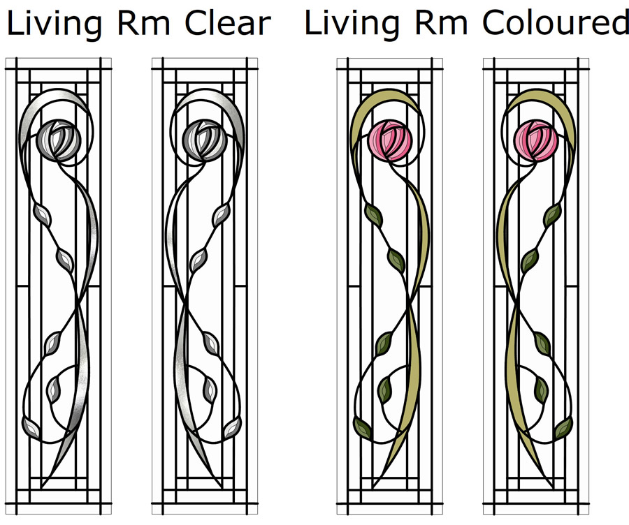 Hi Neil, below are the first drafts of designs requested. I have created 2 versions of the split doors and 2 versions of the larger doors. I based the original quote on the large doors being the large panel from the 2796 commission but I have also added an upgraded version to match the split door style. Further down the page are the two fanlights. The bevelled fanlight will be above one of the large door panels for the Rear Vestibule. Once the layouts are agreed, we can tweak colours and we can then create the En-Suite doors using textures for privacy. If your client likes the layouts but wants extra bevelled leaves etc, the designs can be upgraded as you wish. The bevelled glass roses come in set sizes so are not really suitable to add multiples of these on one panel because things may become too cramped. All of the white sections are clear glass.