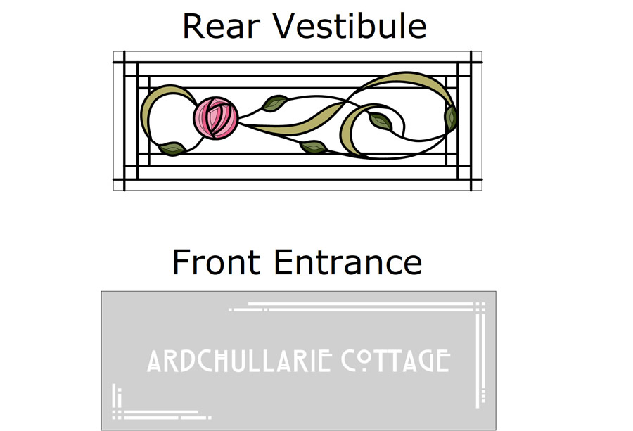 The bevelled fanlight for the Rear Vestibule will sit above one of the large door designs. Regarding the house name fanlight, we can create an etched version with the ARDCHULLARIE text above the COTTAGE text centrally if preferred. Again, please give the studio feedback on what your client likes and what they don’t like and we will alter the layouts to suit.
