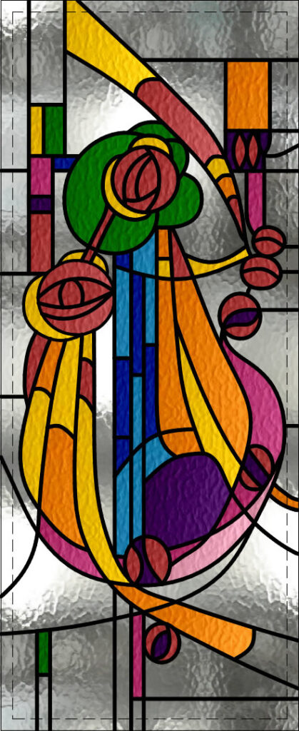 Hi Peter, below is our drawing of the 189 design but shown in your narrower sizes and different colour scheme. The dashed line is the visible area so you won’t see the outer section beyond that line once your installer has fitted the glass. The base glass used on the drawing is Minster glass which is the same as the original 189 design. We have changed the red sections to a the closest colour match to the photo of the wall you supplied. Please let the studio know if this is fine to proceed with manufacture or if you would like any alterations.