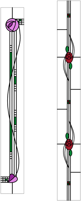 Hello Julie, the below drawings show your chosen designs in your glass sizes. The background shown in white would be clear glass. These drawings are shown from your inside view if you are having the leadwork facing into the house as previously mentioned. We would use our Aged Lead Option 2 and the glass would be Low E glass as requested. Please let the studio know if it is fine to proceed with manufacture.