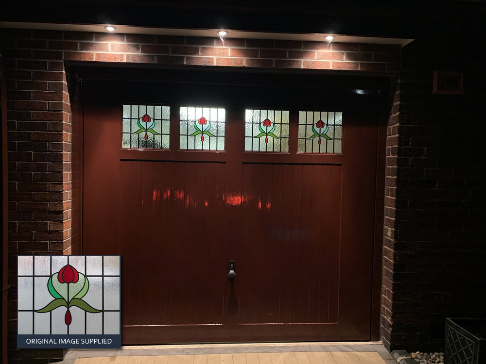 In 2020, a client commissioned us to produce four 1930’s style stained glass fanlights for the garage door of their home. While it is a 1930’s door style design they chose, our glass is suitable for all locations. The design they opted for was not one of our own so they sent an image of a design (featured in the image below) for us to work from. From this image, we produced a computer generated proof for the customer to approve which they were very happy with. As you can see from the finished panels below, our interpretation of the design they sent across is an almost perfect match and it adds some eye-catching character to their garage door.