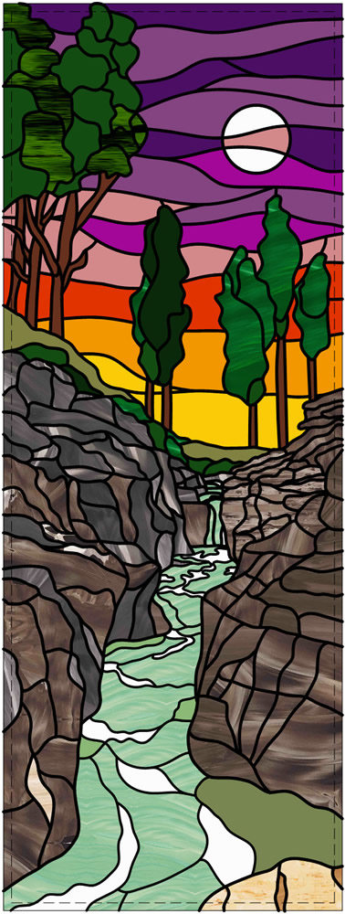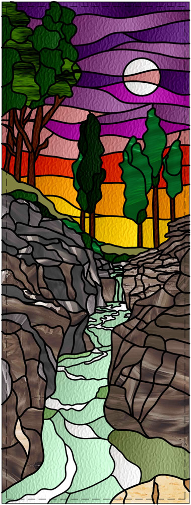 Hi Gillian, below are 2 versions of my interpretation of the Linn Of Dee photo you sent, along with the addition of the night sky from the Menai Bridge commission. I have added 2 versions, the first being flat glass and the second being Minster Glass. The dashed line shows the visible size. Please don’t take too much notice of the colours as these will not be exactly the same when we make the glass. As explained during your studio visit, on jobs like these we like to part colour the panel and send photos to you for approval before finishing the panel. The reason for this is colours come different due to batch variation. We also have stock of many colours that are rare and not available nowadays and we will get these out and look through them as we create the glass. This helps us to find the best colours for a specific project.