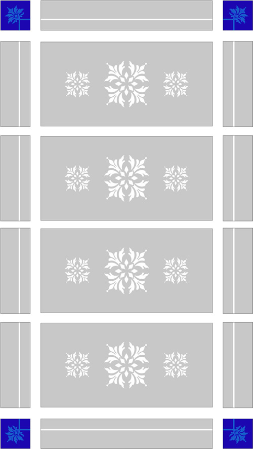 Hello Vera, here is your drawing to show you how the proposed Victorian Etched Glass sash window design looks in your glass sizes. The grey will be etched with the white being clear glass. I have also added a close up photo of how the corners will look. These will be 3mm coloured glass and they will be etched on one side. As they are 3mm thick they cannot be toughened glass. Please let the studio know if it is fine to proceed with manufacture.